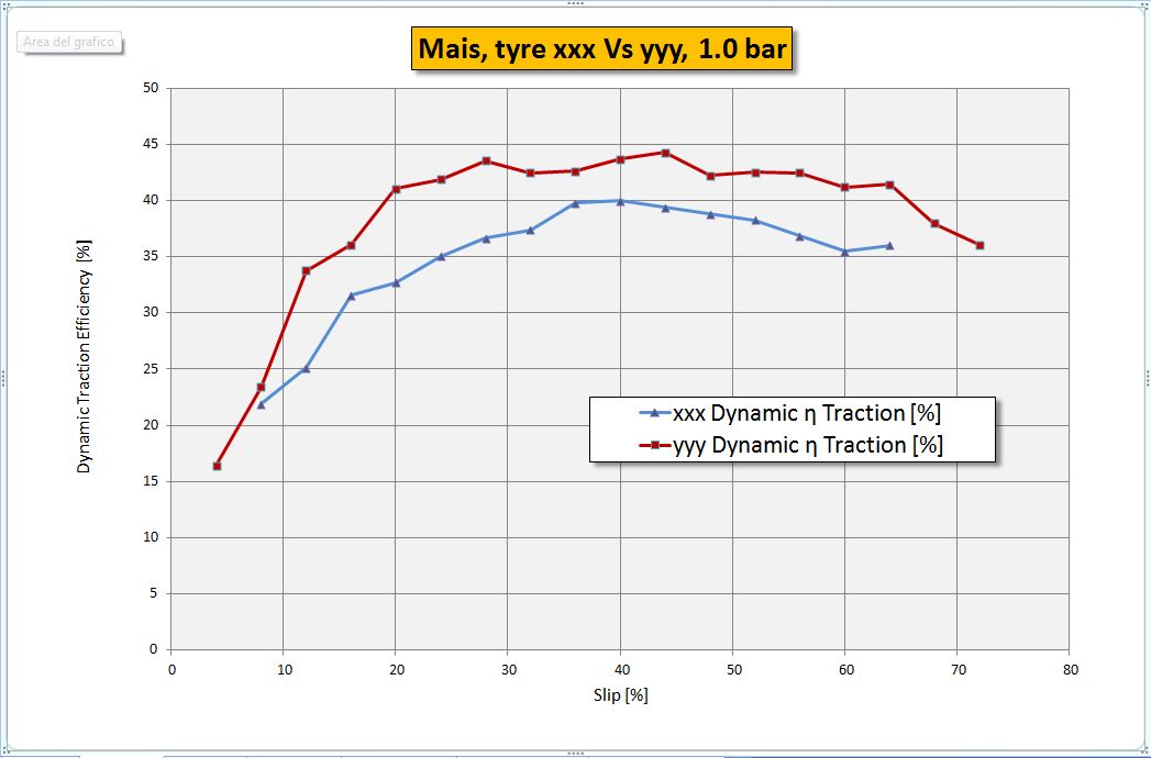 Il grafico Rendimento di Trazione mostra in ordinata il rapporto tra trazione e carico dinamico sul pneumatico che tiene conto della coppia di ribaltamento attorno all'asse posteriore (un errore che spesso viene commesso dai test engineers è di considerare solo il carico statico); il grafico meglio di ogni altra considerazione dà un'idea della differenza di prestazione tra pneumatici.