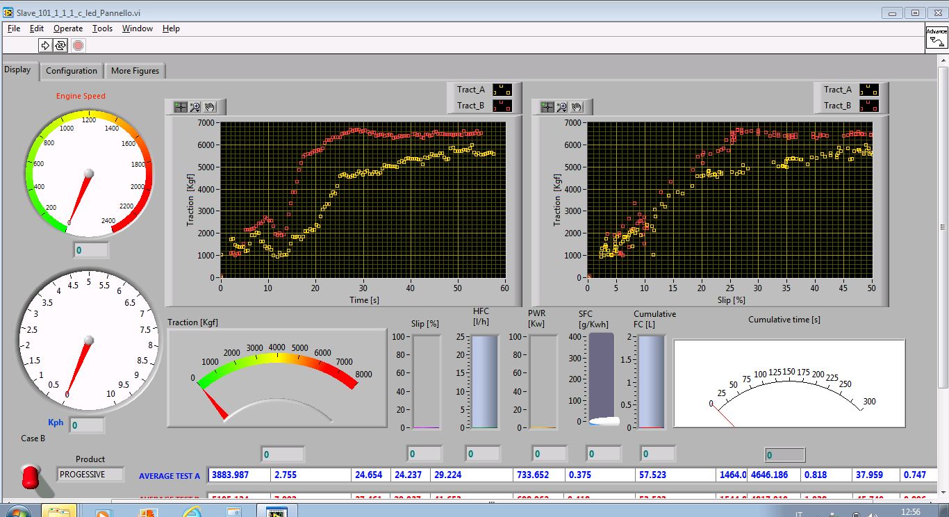 Il salto di qualità avvenne quando realizzai che la catena strumentale che stavo utilizzando era come una bicicletta sgangherata col manubrio storto: era inutile tenere il manubrio dritto per andar diritti ma piuttosto occorreva mantenere il manubrio inclinato quanto basta per mantenere la traiettoria diritta. Era il "quanto basta" che mi sfuggiva sia in termini quantitativi che metodologici. In altre parole era del tutto inutile affidarsi alle caratteristiche nominali dei sensori o ancor peggio al lavoro di taratura di un volonteroso tecnico di laboratorio, occorreva determinare il "quanto basta" ovvero l'errore, personalmente, capire la dipendenza dell'errore dalle apparenti insignificanti condizioni al contorno. Ho appreso sui comportamenti anomali della mia catena strumentale sino alla fine del mio rapporto con l'Azienda per cui lavoravo; grazie alla taratura diretta ho corretto offset, scarti dalla linearità e derive termiche, questo unito a librerie software sempre più evolute (autoprodotte) mi ha permesso di raggiungere una sbalorditiva precisione nella misura dei flussi potenza e nel bilancio energetico del trattore in campo con errori prossimi a quelli di un freno dinamometrico, anche se la misura è eseguita con ben altri strumenti. Ora all'ottimo livello sin qui raggiunto della misura dinamica , si affianca una telemetria (tipicamente posta su trattore) in grado di trasmettere dati provenienti dai sensori installati ad una distanza massima di circa 500 m ad una stazione di terra dove vengono elaborati e, a seconda del n° di canali attivi, della complessità del calcolo, della distanza, della potenza del computer in uso,.. viene prodotto un aggiornamento del pannello sovrastante ad una frequenza non inferiore a 20 Hz in altre parole i dati provenienti dai sensori vengono ricevuti e i parametri calcolati almeno 20 volte al secondo, il pannello poi permette una comprensione rapida rappresentando i dati in forma intuitiva, di ogni parametro viene visualizzato anche il valore numerico istantaneo e medio.